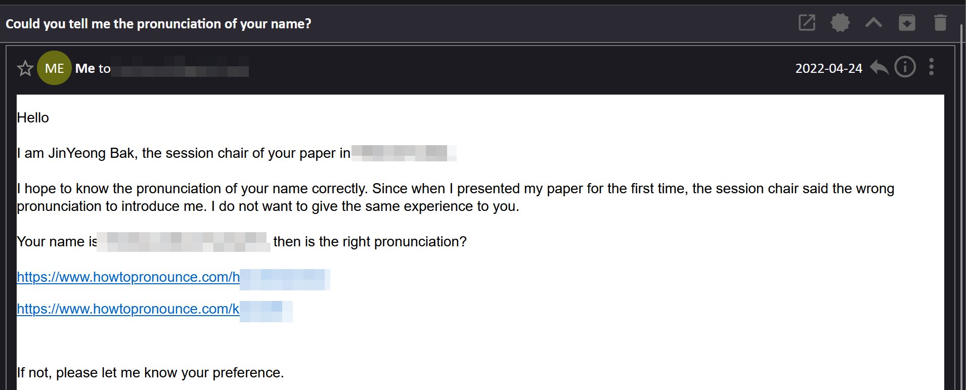 1. 발표자에게 메일을 보내 이름을 어떻게 불러야하는지 묻습니다